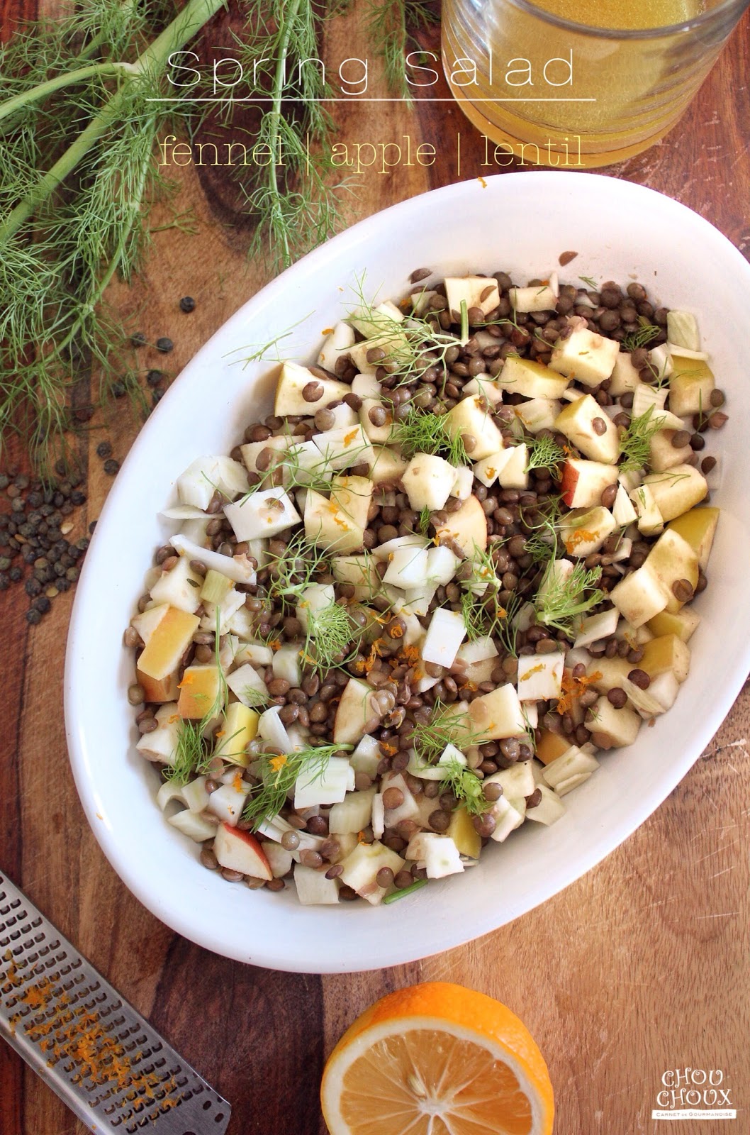 這道簡易的"初春"料理在這個季節食用是再適合不過的了!在國外,法式綠扁豆是素食者很常用來取代肉類的其中一種豆子。這道沙拉可以簡單的與烤過的麵包或魚一起食用,以添加omega-3脂肪酸。它含有高蛋白、維生素C、纖維、鉀及葉酸,也屬於是低熱量及低膽固醇的食物。因為加有球莖茴香,嚼起來有淡淡的五香味,加上那有檸檬與榛果味的沙拉醬,味道非常特別!而最好的一點是它不需要太多烹煮的時間、又簡易,非常適合平日忙碌的上班族喔!